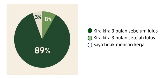 Tracer Study total alumni Profesi Ners tahun 2021-2022 adalah 71 orang. Dari jumlah tersebut, alumni yang telah mengisi kuesioner adalah 62 orang (87,32%). Grafik menggambarkan waktu kerja lulusan Prodi Ners sebelum mereka di wisuda, sebarannya cukup beragam dari 3 bulan sebelum lulus sebanyak 55 dengan presentase 89%, 3 bulan setelah lulus sebanyak 5 orang dengan presentase 8% dan yang tidak mencari pekerjaan sebanyak 2 orang dengan presentase 3%.